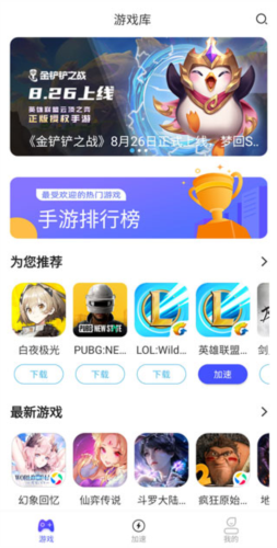 3、游戏下载完成后,点击底部加速按钮,进入加速页面即可看到手机中已安装的游戏,该功能也适用于部分外服应用。