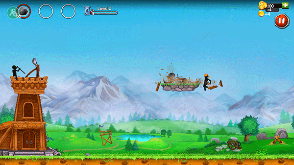 1、开始游戏后,滑动屏幕上的弹弓,当瞄准虚线显示为绿色时代表投射角度最佳,将石块投向对面火柴人直至其被击败。