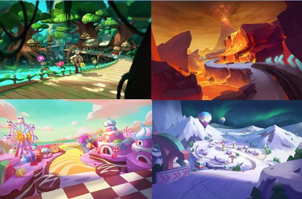 风格各异的赛道可供选择:气势磅礴的沙漠赛道、白雪皑皑的高山滑雪场、充满甜蜜气息的糖果赛道,每一条都是亮丽的风景线。