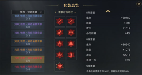 现有三类穷奇套装,分别为专注、庇护与愤怒套装;每类套装又分蓝、紫、橙、红四种品质,不同套装提供的属性侧重各有区别。