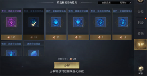 使用命纹结晶可为装备打造命纹,结晶品质从低到高分为蓝、紫、橙、红;打造必须按品质顺序逐步进行,高品质命纹无法直接装备。