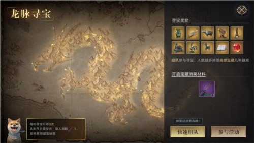 龙脉寻宝消耗道具洛阳铲,可组队或单独进行;每轮可开启三个藏宝点,每次消耗一个铲子;获得的未鉴定藏品可在鉴定室进行鉴定。