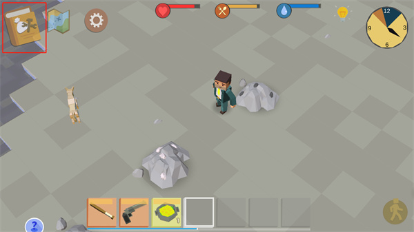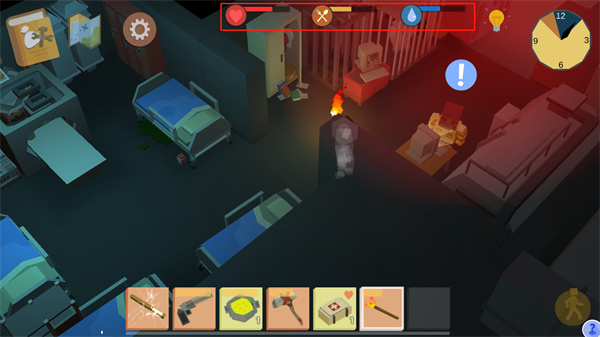 10、游玩时注意屏幕上方的血条、饱食度与水分;饱食度与水分耗尽将持续扣除生命,生命值归零则游戏失败。