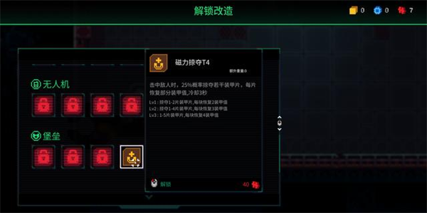 基础改造与进阶改造在关卡中的装配台进行,消耗蓝色素材即可升级或安装改造能力。前期推荐优先选择堡垒等生存向改造,后期再根据装备调整。