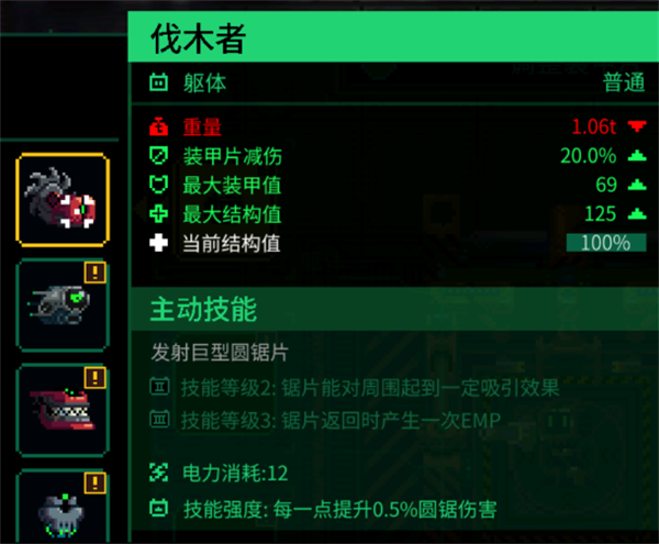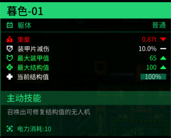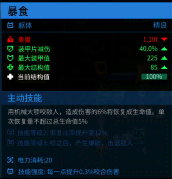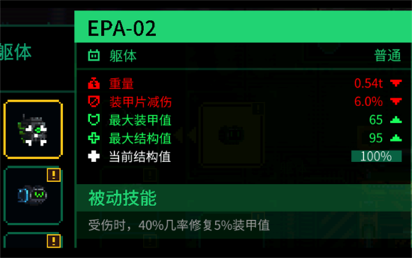 了解基础属性后,面临的是躯体选择问题。游戏中躯体种类繁多,例如这款减伤与血甲较低,但附带回复技能。