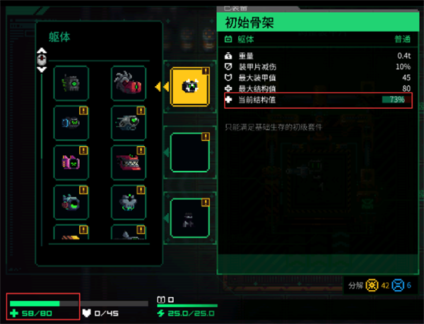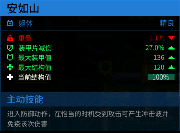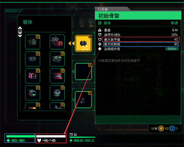 1、最大装甲值、最大结构值与当前结构值装甲值等同于护甲,结构值等同于生命值。最大数值代表护甲与血量的上限。例如最大装甲值45对应左下角45点护甲;最大结构值80对应80点生命。