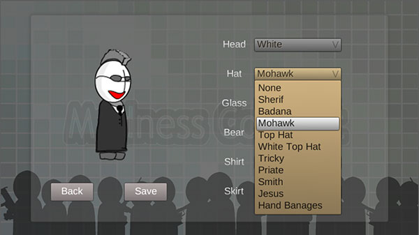 步骤2:接着在右侧选择“Head”、“Hat”、“Glass”、“Shirt”等外观项目,自定义发型、眼镜、肤色与服装,完成后点击“Save”保存设定。
