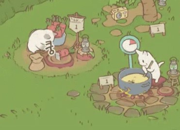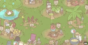在森林中与猫咪一起经营汤铺,它们会热火朝天地熬汤、处理萝卜与南瓜;也有些猫咪喜欢偷懒,玩吊床或四处串门。