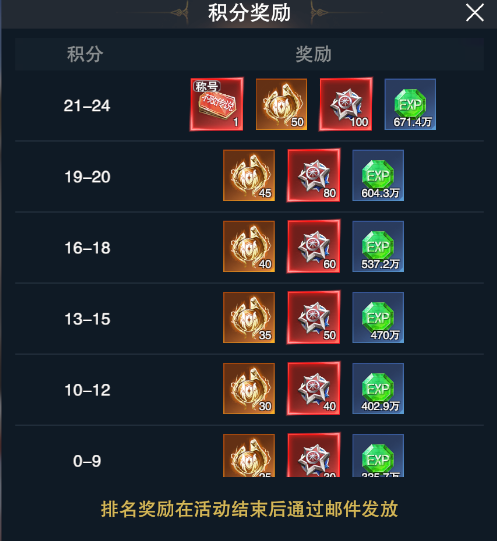 积分规则:在比赛中获胜可获得三点积分,失利则没有积分。八场比赛全部结束后,系统将根据玩家获得的总积分所在区间,通过邮件发放相应奖励。