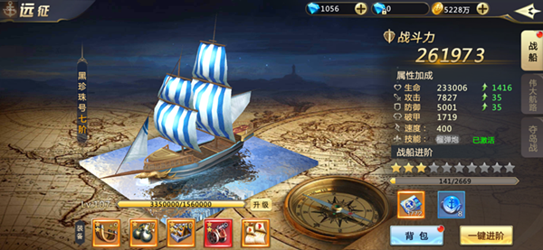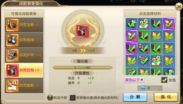 伟大航路中获取的战船装备可大幅提升战力,战船可穿戴装备;装备品质与星级越高,属性加成越多,战船装备支持强化操作。
