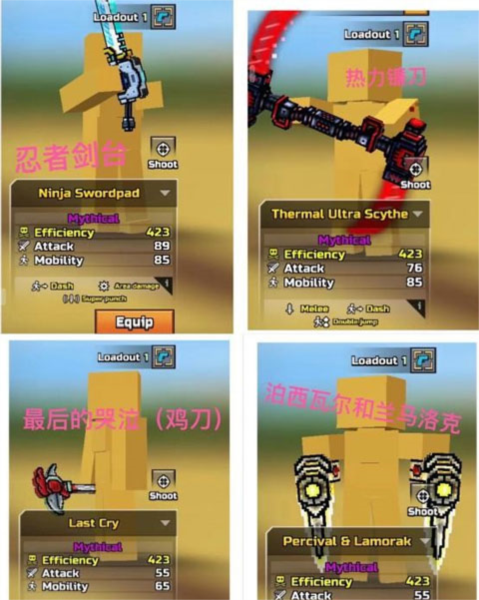 常见冲刺刀的移动效率对比:热力镰刀高于医疗外科模块,后者约等于忍者剑台,它们又高于泊西瓦尔和兰马洛克,最后的哭泣效率相对较低。