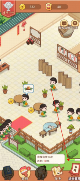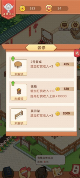 2、主要操作包括升级装修物件、布置店面设施;通过点击即可完成装饰强化,逐步提升客栈档次与客容量。