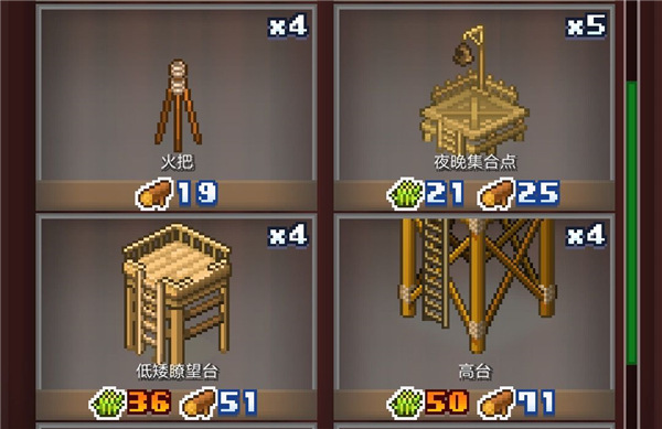 研究解锁需求:火把需要优质砖块20个以上及铜币135以上;夜晚集合点需要结实木板31个以上及铜币1265以上;低矮瞭望台需要大钉子49个以上及铜币5550以上;高台需要牢固绳子75个以上及铜币9999以上。