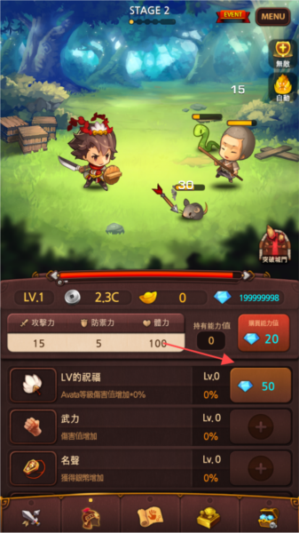3、通过消耗钻石点击【LV的祝福】等能力选项,可增强角色属性,帮助完成关卡挑战。