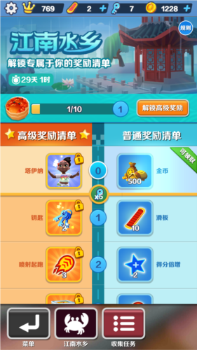 1、限时活动-江南水乡:通过无尽模式赛道或指定任务收集「大闸蟹」,解锁高级奖励清单可获得角色「塔伊纳」和深海主题滑板「蝠鲼」;