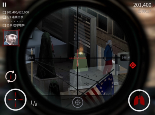 游戏采用第一人称视角,提供2至12倍变焦瞄准镜,支持爆头或心脏等精准射击。每个关卡有明确的暗杀目标,完成支线任务可获得奖励并解锁后续内容。升级与合成武器是顺利通关的关键,任务中收集的武器碎片可用于合成更高级别的装备。