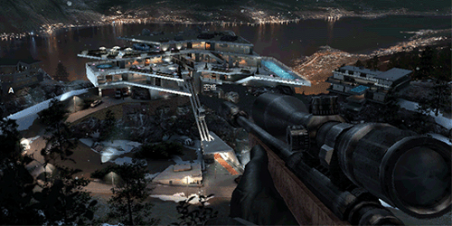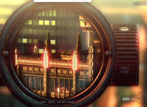 场景内有一个车库,其中停有两辆汽车。射击那辆大部分车身位于车库内的车辆,可以触发警报。随后会有一名警卫前来查看车辆,此时楼上另一名警卫也会透过玻璃向下观察。抓住时机击碎玻璃,落下的碎片可同时击中两人,完成连锁击杀。