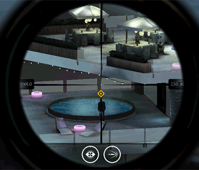 首先打开电箱引发爆炸,清除特定保安。接着射击游泳池旁的火炉,将其炸入泳池。最后打开空调室外机的主板,待警卫靠近后再次射击主板,利用风力将其推下。