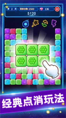 3、多元模式玩法:涵盖经典、六角、拖动、方块等多种模式,满足不同玩家的消除需求。
