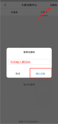 ② 入口二:直接点击页面中间的“兑换券”按钮,将获得的卡密复制到输入框内,点击确认进行兑换。
