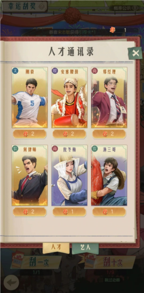 开局幸运刮奖会赠送一张引荐卡,这类卡片相当重要,建议积攒两张再进行兑换,因为前期兑换紫色卓越品质人才或艺人的性价比不高;第二张引荐卡可通过抽取或碎片合成获得,首次兑换推荐选择郑经理,他能增加两次广场斗鸡活动次数,实用性较强。