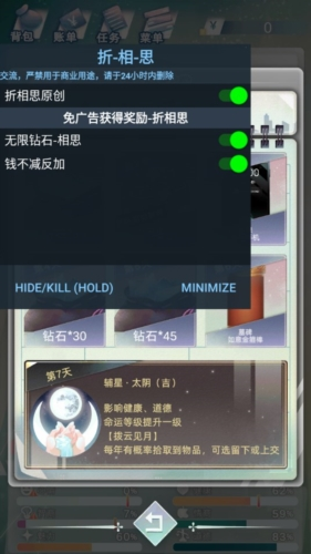 当代人生折相思2025版是一款充满趣味的模拟经营类游戏,本次带来的是2023年更新的菜单版本,玩家能够免费获取大量钻石,使用货币时在满足条件下不仅不会减少,反而可能增加,这让你能更轻松地应对各种挑战。在游戏中,你将经历转世重生,体验从不同家庭出身到生儿育女等丰富事件,过程中需要密切关注自身属性,这些属性会随着事件发展而动态变化,整体玩法融入了受玩家喜爱的Roguelike随机元素。此版本模拟了人的完整一生,从出生到衰老,你需要做出各种选择,结交朋友,每个决定都可能导向截然不同的人生轨迹,感兴趣的话不妨下载试试。