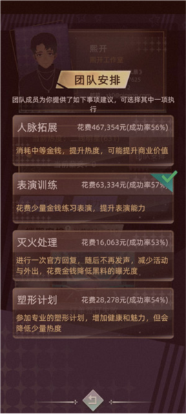 5、能力提升方面,数码商店的鸭梨3s设备可增加智力与魅力;健身能提升健康值与魅力;不建议进行整容,可能降低健康与魅力;其余主要通过阅读书籍来提升;重点提升演技属性,电视台提供的通告数量多且报酬丰厚;属性提升优先级建议为:演技大于舞蹈,舞蹈大于声乐。