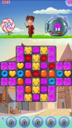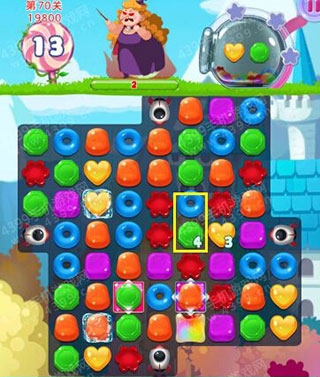 关卡目标:通过消除黄绿两色糖果击败生命值两百的胖女巫。