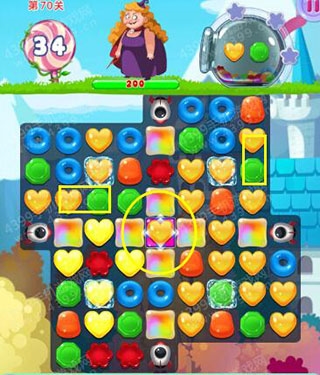 通关技巧:在导弹糖果加持下难度适中;关键是打通中间获得加持效果的彩虹糖位置,将黄绿糖果集中在此消除。