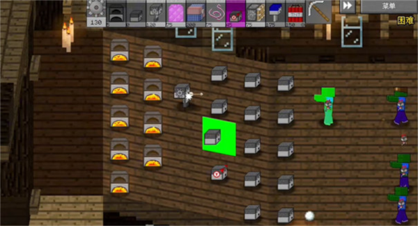 2. 在像素沙盒场地中对抗僵尸,合理放置武器来应对不同的敌人。