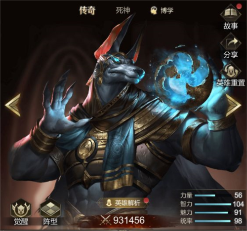 英雄简介:初始属性:力量56,智力98,魅力91,统率92;定位为远战回合技能爆发型英雄。