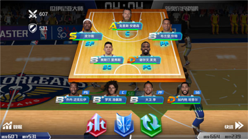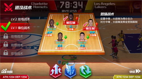 其次需了解,每种战术都有针对性;若对方重点防守你的PF与C(主要防守球员脚下显示盾牌),你可选用小球战术,主打PG与SG以避开防守强点,或选用摇摆人战术主攻SG与SF。具体选择取决于对应位置球员的能力强弱,例如你的SF评分为S+而PG仅为S-,此时选用摇摆人战术更佳。