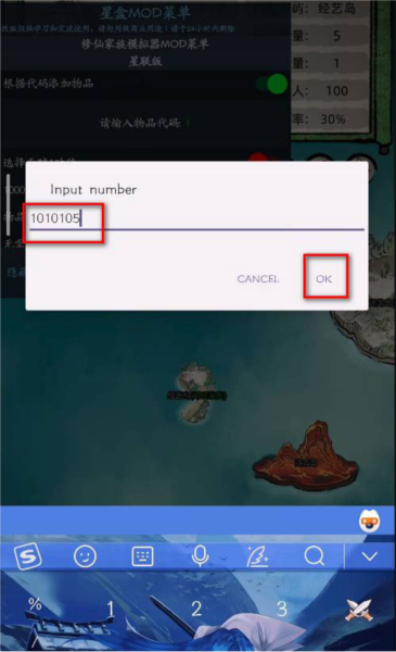 5、以物品“聚灵丹”为例,输入其对应代码“1010105”,随后点击右下角的“OK”确认。