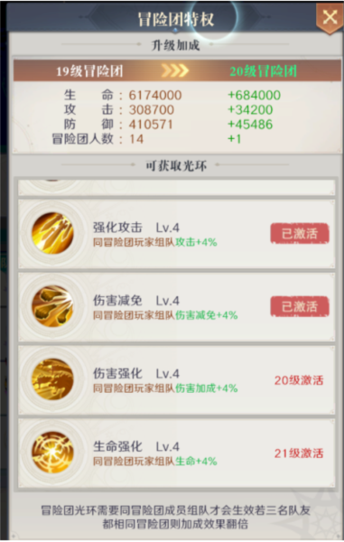其他经验加成:加入冒险团可跨服组队,团员组队挑战副本能获得属性集成,例如伤害增加与经验提升;冒险团还设有等级奖励,可领取大量钻石。