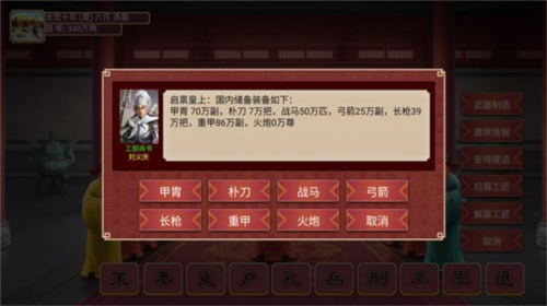 装备方面,需命令工部进行制造,每回合仅能生产一批,因此建议尽早开始逐步打造;部分高级装备需要特定建筑支持才能制作,且建筑需达到三级,故应提前规划建造相关设施。