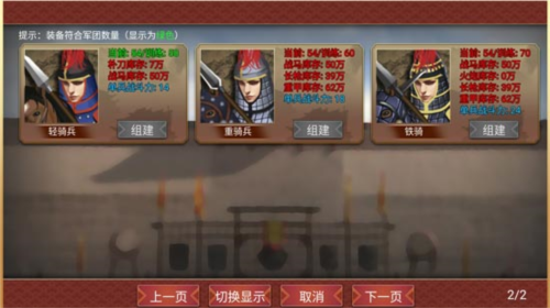 兵种选项中的绿色表示条件已满足,红色则表示未满足;组建军团需满足训练度与装备两项条件。