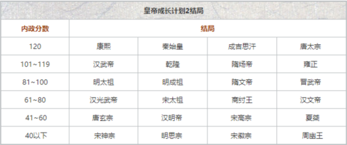 4、霹雳皇帝:此为最高评价结局,需满足多项严苛条件;包括四项能力值均达到五百,同时成为孝子与慈父,占领全部领土,各城平均生活水平接近极富,平均民生指数超过八十五,修建完四段长城,且皇威数值突破两千。