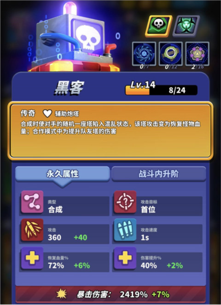 黑客:合成时随机为队友炮塔附加伤害增益,为团队提供高额输出加成,需在游戏内将其等级升至最高。