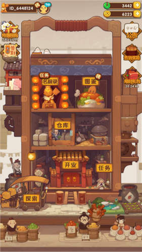 1、启动游戏后进入主界面,可以看到名厨录、图鉴、仓库、开业、探索以及任务等主要功能入口。
