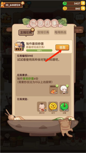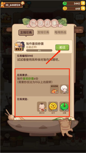 7、任务界面分为主线、支线与每周挑战;例如当前任务要求制作番茄炒蛋,明确列出了任务目标与完成奖励,点击前往即可开始。