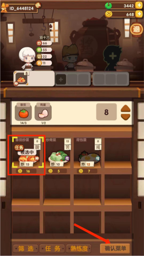 8、进入厨房后,根据提示选择对应食材,然后点击界面右下角的确认菜单按钮。