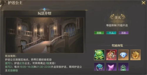 护送公主到达安全地点,不仅能展现英雄气概,还可领取巨额经验奖励;技巧一:优先选择红色品质公主,奖励直接提升至3倍;技巧二:注意活动时间,每日16:05-16:35与21:30-22:00为双倍护送时段,奖励翻倍。