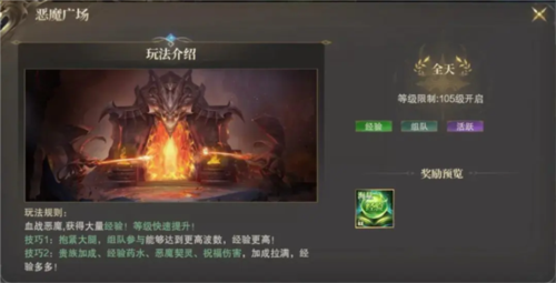 进入恶魔广场与怪物激战,收割海量经验;技巧一:组队进行挑战,依靠团队力量冲击更高波次,收获更丰厚;技巧二:综合运用贵族特权、经验药水、恶魔契灵与祝福伤害等加成手段,使经验收益达到最大。
