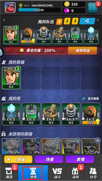 3、炮塔界面用于搭配阵容、查看英雄、升级防御塔以及管理场景与表情。