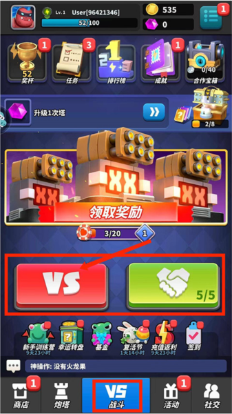 1、启动游戏后进入主界面,主要栏目包括商店、炮塔、战斗、活动与社交。