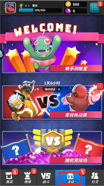 8、活动界面包含新手训练营、竞技挑战赛、随机竞技场等多种活动可供参与。