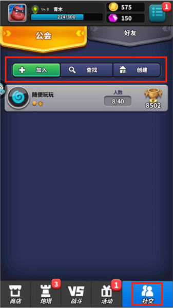 9、社交界面允许玩家加入、查找或创建工会,也可以添加好友。