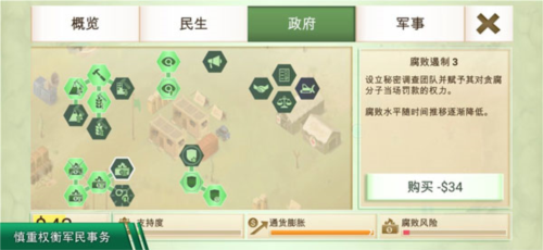 发展体系分为民生、政府与军事三类,均需投入资金解锁。投资民生可提升支持度,但可能引发通货膨胀与腐败风险;通货膨胀随时间缓解,腐败则需通过政府投资来遏制。快速打击叛军可选择空袭,却可能误伤平民,招致怨恨。军事行动同样消耗大量资金,平衡收支是玩家面临的核心难题之一。