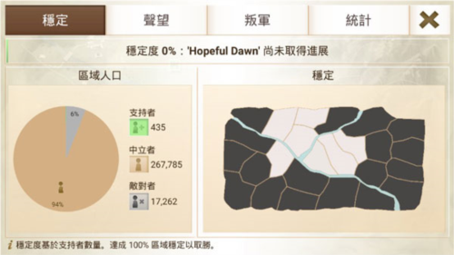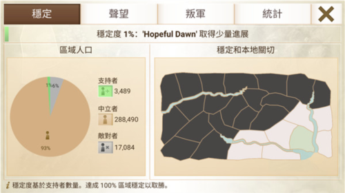 声望获取受政策效果与民众支持度影响。开局支持度较低,通过发展民生与举行选举可提升支持度,成功的民主选举能带来持续的声望增长。每稳定一个地区也会立即获得声望奖励,稳定区域越多,反对者越少,声望积累越快。