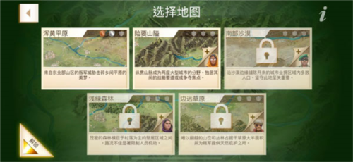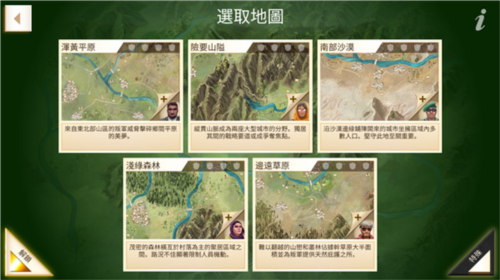 游戏对地理布局十分考究,玩家需权衡势力扩张的时机,并利用地形优势逐个击破叛军。游戏提供五张各具特色的地图:浑黄平原、险要山隘、南部沙漠、浅绿森林与边远草原。